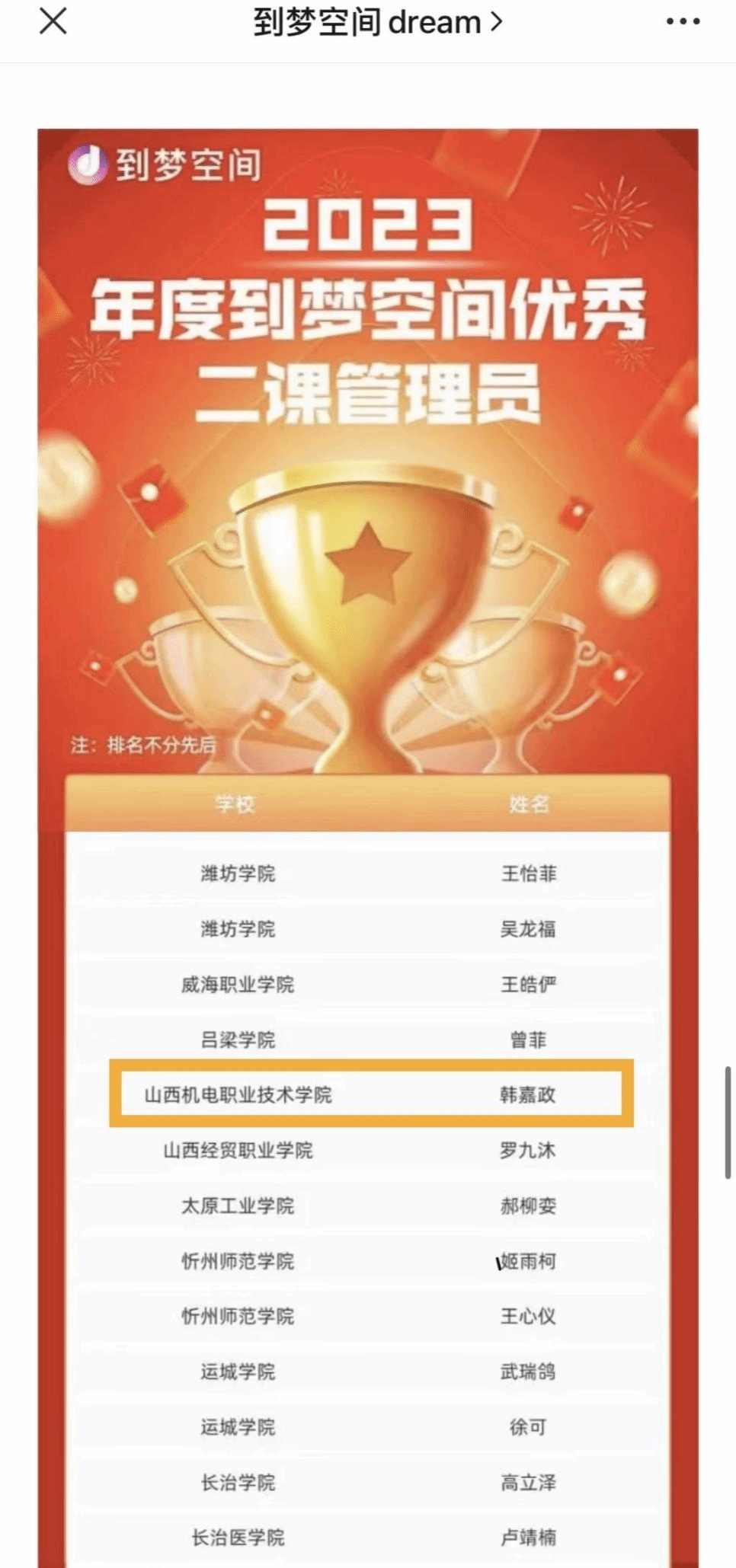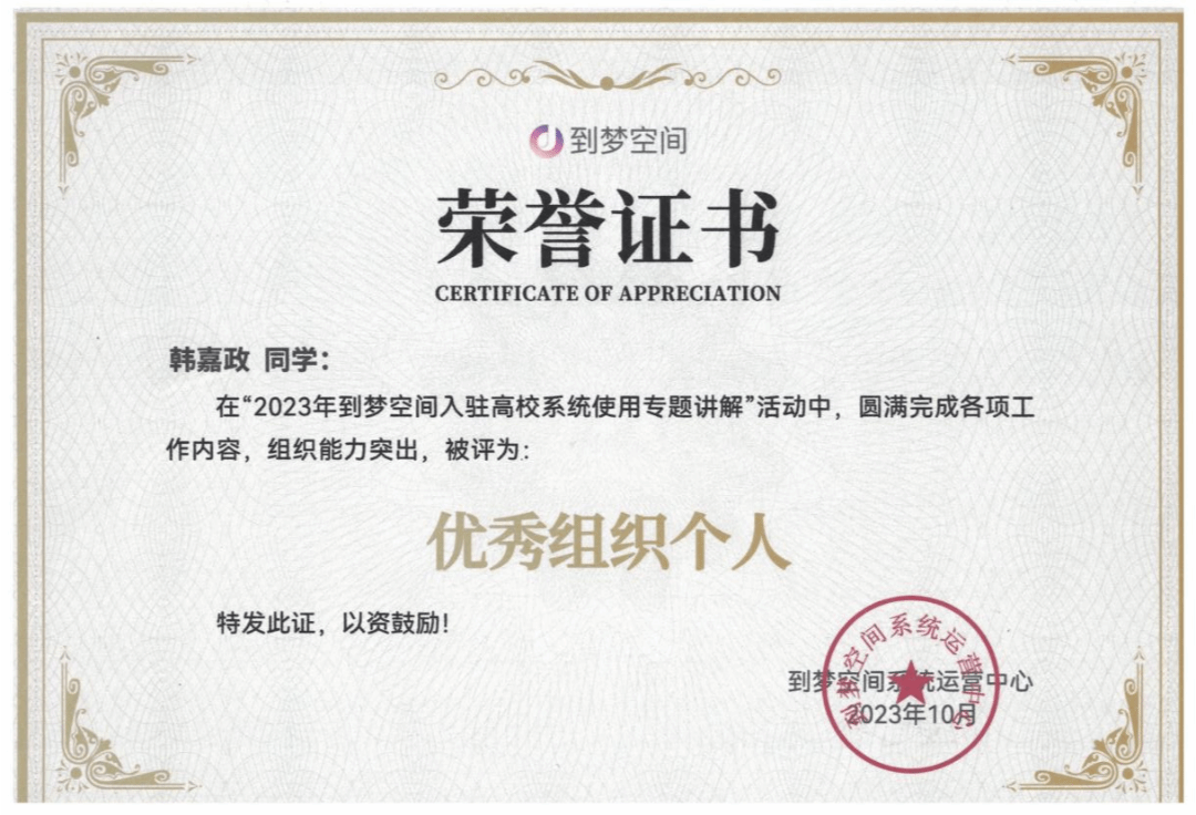 为有效发挥第二课堂对高校优化人才培养的支持功能,发挥到梦空间系统助力高校共青团"第二课堂成绩单"制度改革的作用,深化榜样教育,提升“二课”管理员的荣誉感,到梦空间系统运营中心开展2023年度到梦空间优秀二课管理员评选活动,通过学生自荐、院团委推荐等方式上报有突出贡献的同学,到梦空间系统运营中心评议组评审、复核、审定,在提交的573份评选材料中共评选出192位年度到梦空间优秀二课管理员,我校团委韩嘉政同学成功入选。
